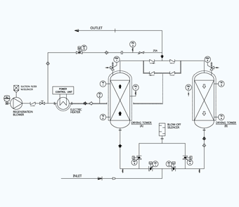제습 및 재생 사이클의 시간은 8시간 진행되며, 한쪽 흡착 탱크가 제습 활동을 진행할 때 다른 흡착 탱크 재생을 위해서 외부 공기를 Blower로 흡입하여 재생 가열 공기 및 냉각 공기로 사용하며, 건조 공기는 필요에 따라 미량을 사용하게 됩니다.